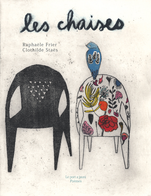 Toutes les chaises sur lesquelles je me suis assise, toutes les chaises qui ont compté, les chaises de ma vie… À partir de ce thème, Raphaële Frier raconte sa première chaise haute comme le toit du monde, la chaise d’attente, les chaises longues qui occultent les courtes, la chaise de cuisine qui côtoie la farine et les odeurs de graille, des chaises tristes comme celle de l’absent ou des chaises loufoques comme les chaises volantes. Et à son tour, Clothilde Staës grave de ses belles gravures réhaussées, les chaises qui dans sa vie ont compté.