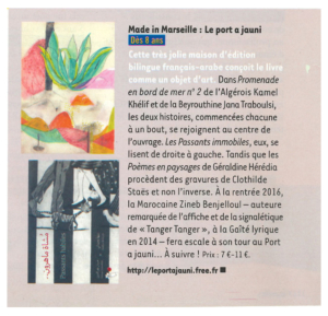Le Port a jauni publie des albums jeunesse bilingues et des ouvrages poétiques en français et en arabe. Les livres bilingues sont imaginés et conçus pour jouer avec le double sens de lecture du français et de l’arabe.