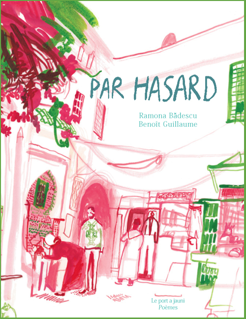 Par hasard poèmes de Ramona Bădescu * illustrations de Benoît Guillaume traduit en arabe par Nada Issa Ce recueil a été créé en résidence artistique à Dar Ben Jelloun, Tétouan, en mai 2018. Par hasard, Ramona Bădescu et Benoît Guillaume ont choisi des lieux et des moments où ils se